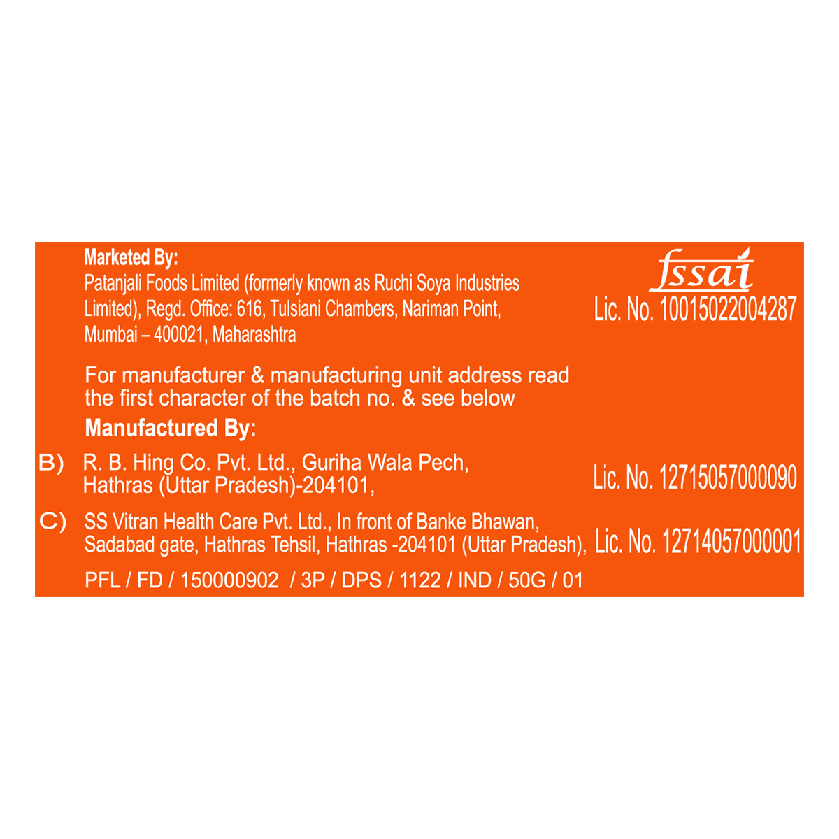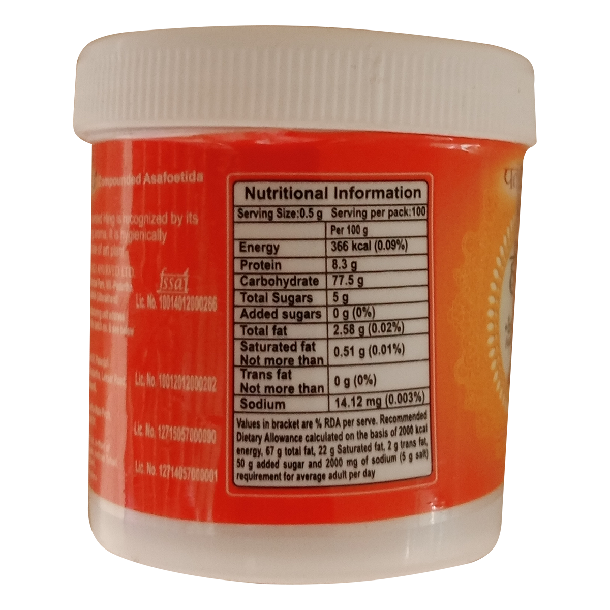 Patanjali Bandhani Hing (unrefined asafoetida) is a premium-quality hing recognized for its quality and strong aroma. Major ingredients in Patanjali Bandhani Hing include edible cereal flour, gum arabic, and asafoetida.