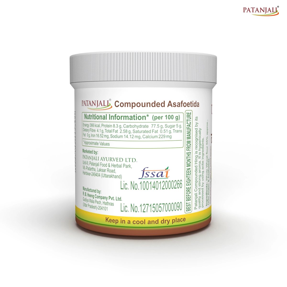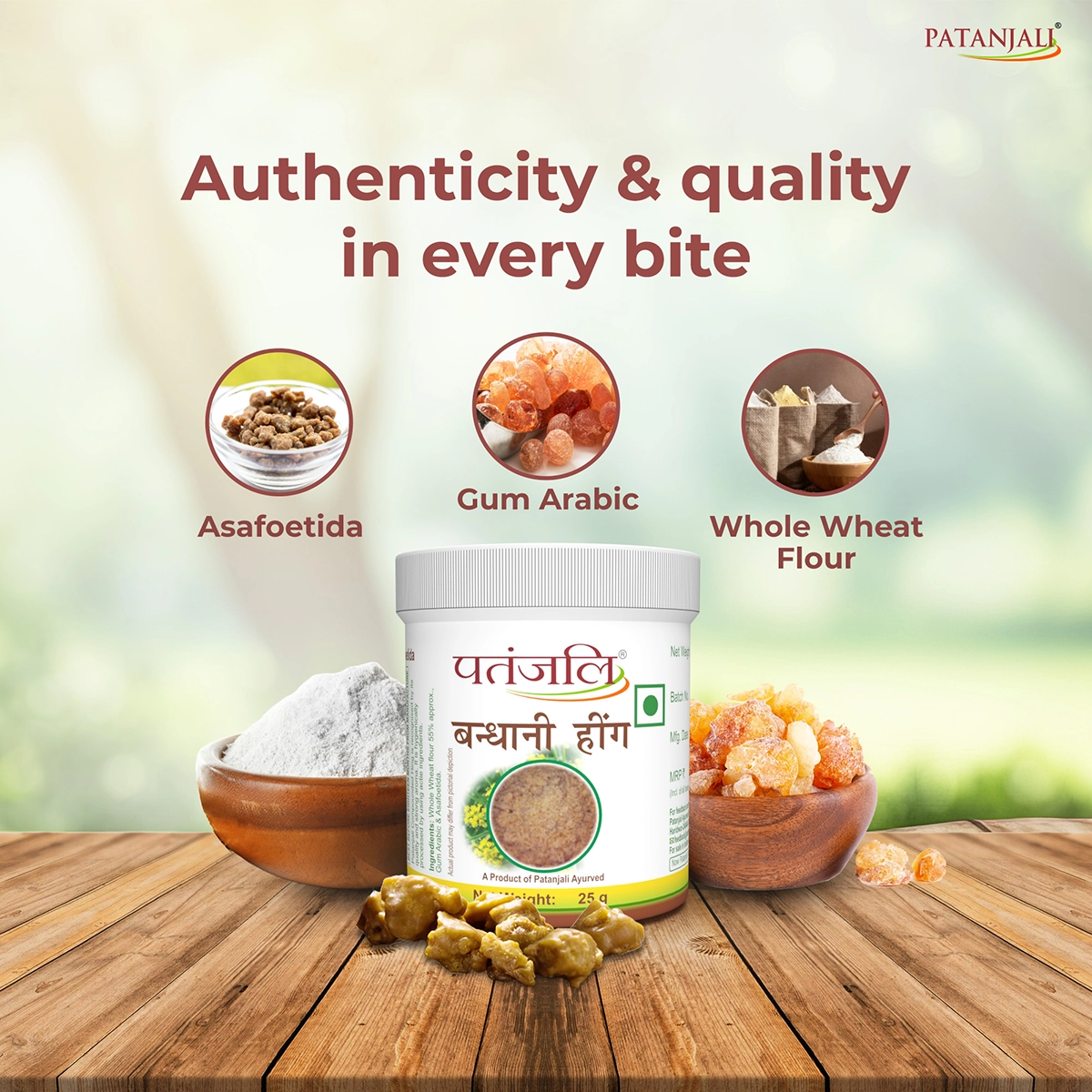 Patanjali Bandhani Hing (unrefined asafoetida) is a premium-quality hing recognized for its quality and strong aroma. Major ingredients in Patanjali Bandhani Hing include edible cereal flour, gum arabic, and asafoetida.